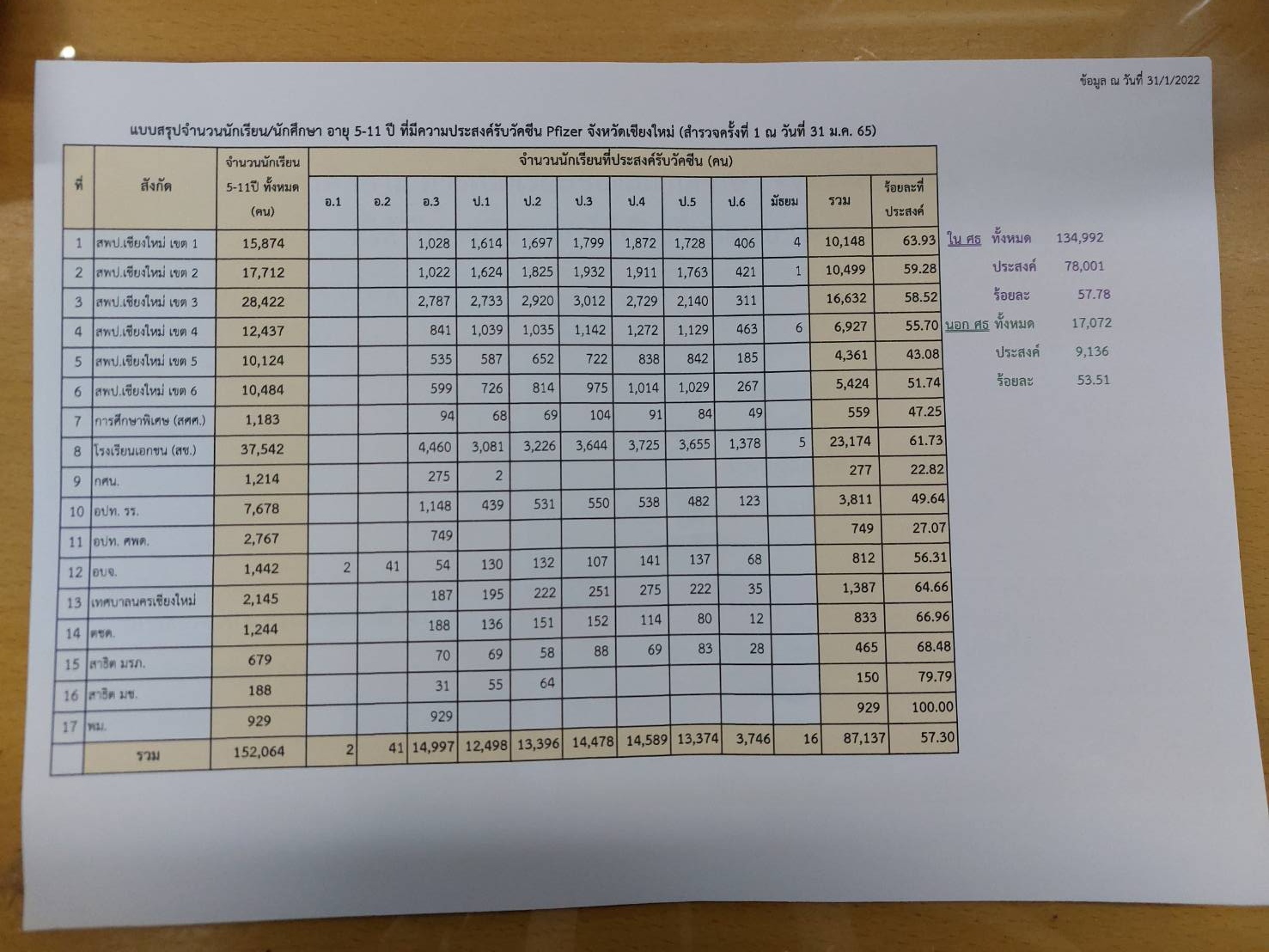 ในส่วนของการฉีดวัคชีน Pfizer ในกลุ่มเด็กนักเรียนอายุ 5-11 ปีนั้น ขณะนี้สำนักงานศึกษาธิการจังหวัดเชียงใหม่ได้รวบรวมข้อมูลจำนวนนักเรียนที่มีอายุ 5-11 ปี ทั้งหมด 152,064 คน โดยจากการสำรวจ มีนักเรียนที่ผู้ปกครองประสงค์ฉีดวัคซีนไฟเซอร์เด็กแล้ว 87,137 คน คิดเป็นร้อยละ 57.30 ซึ่งเด็กนักเรียนอายุ 5-11 ปี กลุ่มแรกที่จะได้รับวัคน คือ เด็กที่มีโรคประจำตัว 7 กลุ่มโรคโดยสถานพยาบาลจะติดต่อผู้ปกครองเพื่อนัดหมาย หรือขอให้ผู้ปกครองติดต่อสถานพยาบาลที่รับการรักษาอยู่เพื่อนัดหมายเข้ารับการฉีดวัคซีนต่อไป หลังจากนั้นจะดำเนินการผ่านระบบสถานศึกษา จัดสรรให้เด็กนักเรียนระดับชั้นประถมศึกษาปีที่ 6 เป็นอันดับแรก